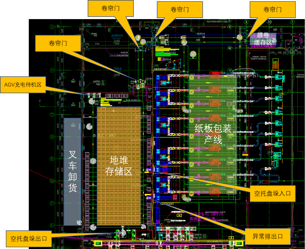 项目布局有立体库、包装线、缓存库,其中涉及AGV的流程主要有: