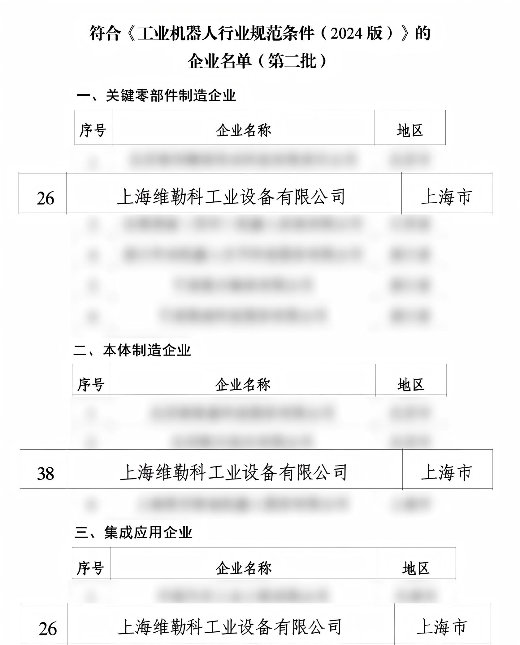 在工业和信息化部最新公布的第二批符合《工业机器人行业规范条件》的企业名录中,维勒科凭借其在核心技术、平台架构及质量管控方面的卓越表现,成功通过官方审核,被正式认定为行业规范企业。值得注意的是,维勒科是本批次中唯一一家实现了从核心零部件、机器人本体到产线系统集成全链路深度融合的平台型企业。